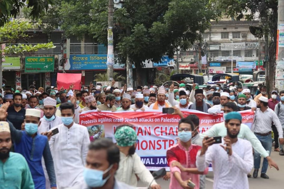 Human chain and Large demonstrations have held under the banners of Ahle Sunnat Wal Jamaat in big cities around Bangladesh in condemnation of Israel’s actions at occupying Palestinian. Demonstrators on Thursday also rallied to denounce the ongoing crackdown at the Al-Aqsa Mosque compound in Jerusalem’s Old City, as well as Israeli plans to forcefully expel Palestinians from their homes in occupied East Jerusalem.
